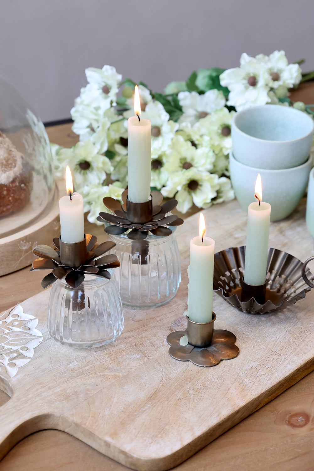 Den Flaschenaufsatz für handelsübliche Stabkerzen mit einem Ø von 22mm gibt es auch als wunderschöne Blume. In Messingoptik schön kombinierbar mit allen Einrichtungsstilen.