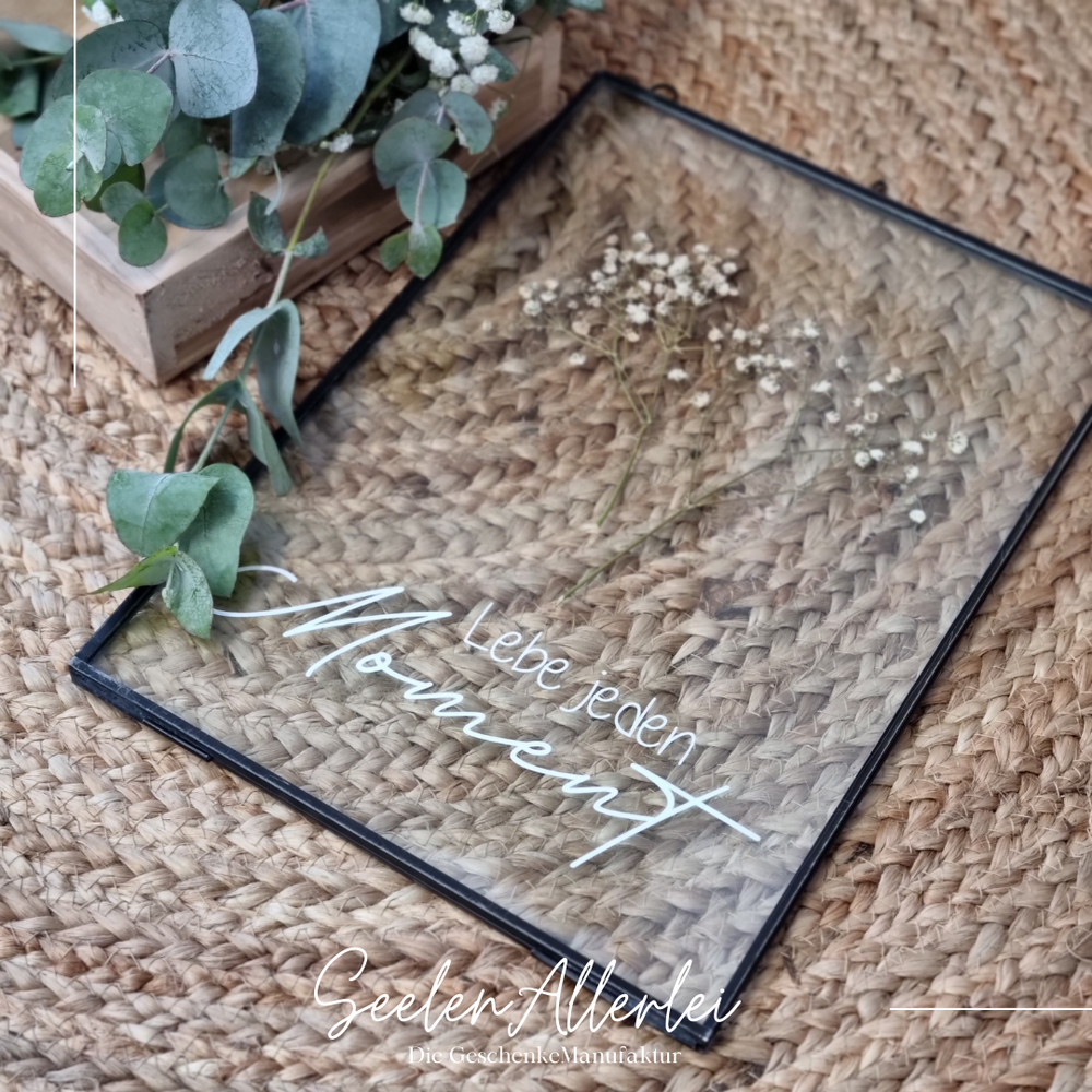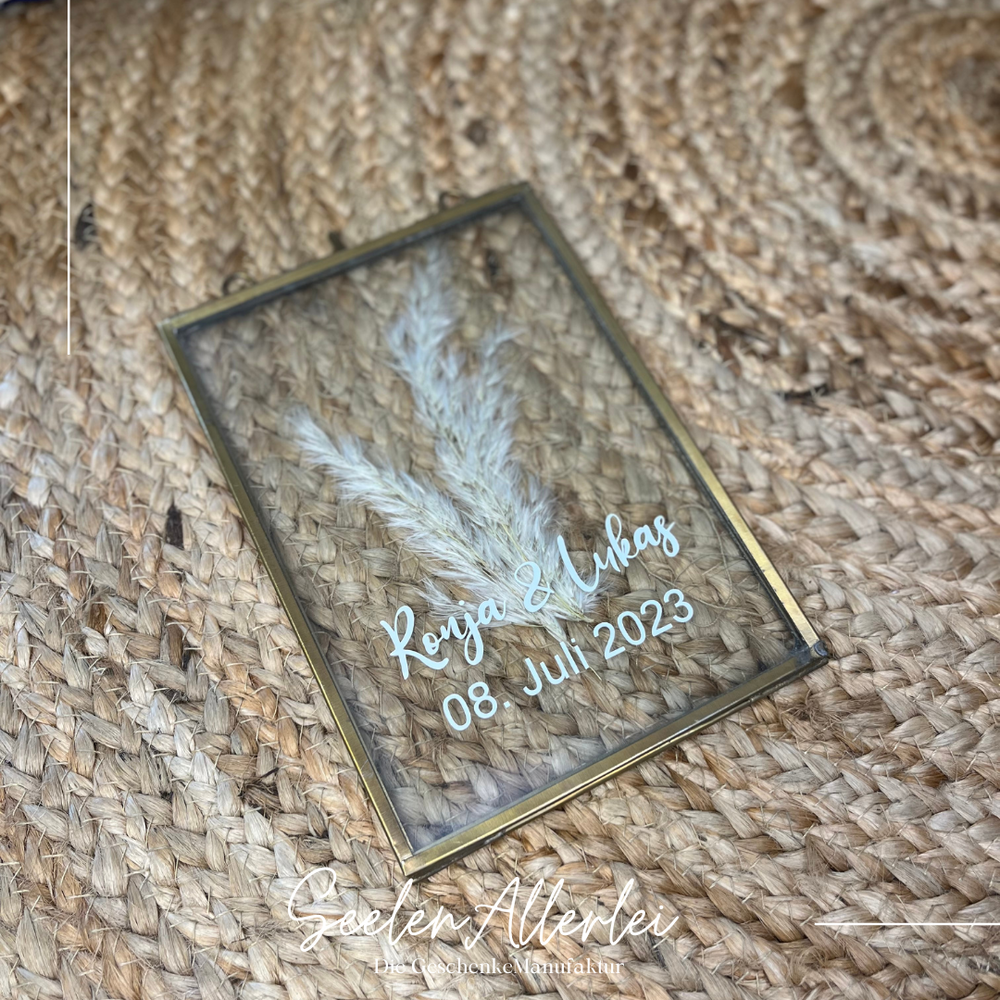 Wir personalisieren Deinen Glasrahmen mit verschiedenen Sprüchen oder auch zu Anlässen wie einer Hochzeit. Unter Zusatzangaben kannst du die Namen des Brautpaares angeben, so entsteht ein ganz individuelles Geschenk.