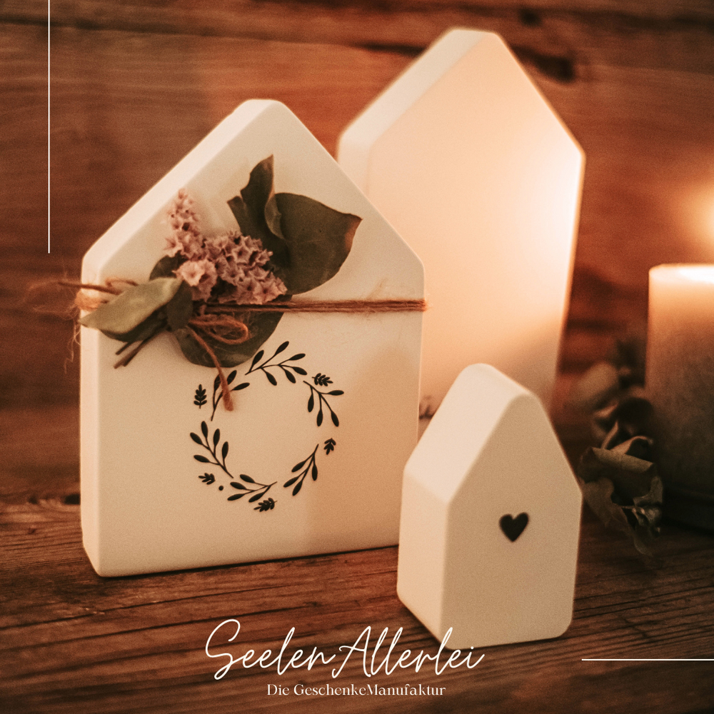 Mit diesen Häusern kannst Du wunderbar Deine Fensterbank oder auch die Kommode dekorieren. Als Arrangement auf einem Tablett oder auch einzeln sehen diese schlichten Häuser richtig gut aus.