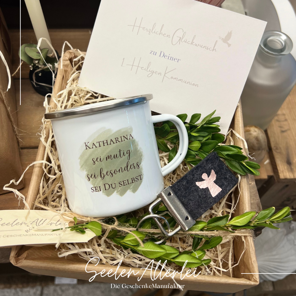 Ein wunderschönes personalisiertes Set zur Kommunion bestehend aus einem kleinen Schlüsselanhänger mit Schutzengel und der Aufschrift FÜR DICH, einer personalisierten Emaille-Tasse mit Namen und einer Glückwunschkarte.