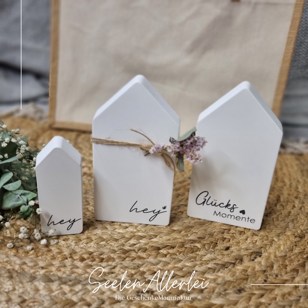 Zusätzlich zu unseren Raysin und Holz Häusern haben wir auch MINIhäuser aus Raysin, die wir mit einem einfachen "hey" | Herzchen | Blumen | Zweigen versehen.
