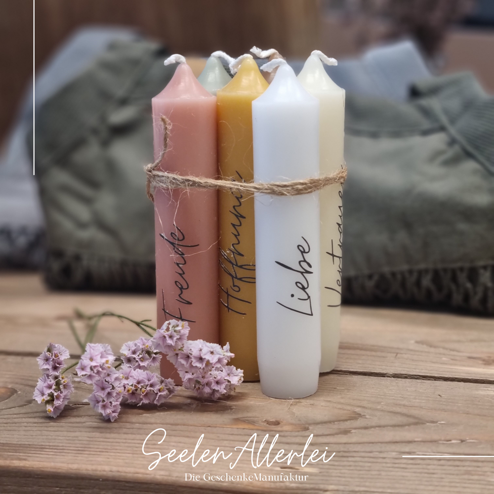 Du bekommst ein 6er Set Kerzen mit dem Aufdruck HOFFNUNG, LIEBE, VERTRAUEN, GLÜCK, FREUDE und KRAFT